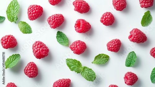 A flat lay of fresh raspberries and mint leaves on a white background.