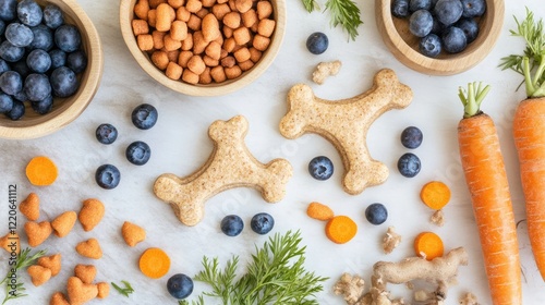 A flat lay of gourmet pet treats shaped like bones and fish, arranged alongside natural ingredients like blueberries and carrots.
