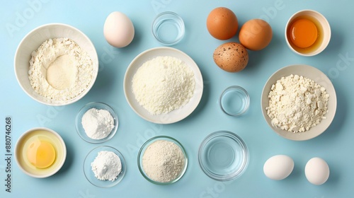 A flat lay of ingredients for making a cake, including flour, sugar, eggs, and a mixing bowl