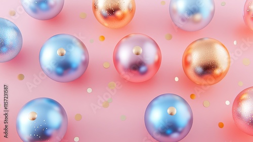 A flat lay of metallic and matte ornament balls in shades of pink, blue, and gold on a shiny background.