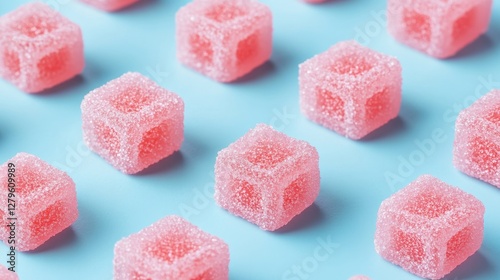 A flat lay of tasty pink chewing gums against a light blue background, with room for text. Modern