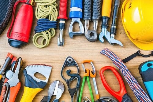 A flat lay of various tools and equipment for outdoor activities and adventures, laid out on a wooden surface.
