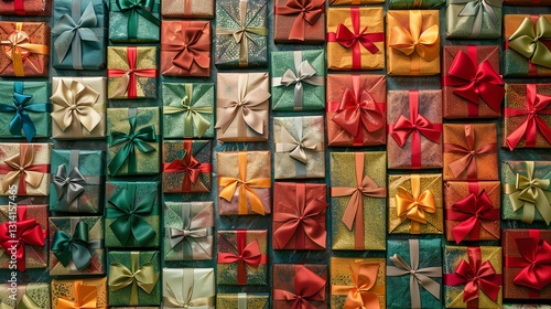 A flat lay of various wrapped presents with colorful ribbons.