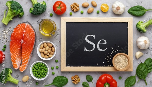 a flat lay showcasing selenium-rich foods like salmon, almonds, broccoli, and peas arranged around a chalkboard displaying the chemical symbol "se".