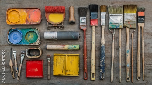 A flat lay view of painting tools against a wooden background includes paintbrushes, rollers, paints and various accessories.