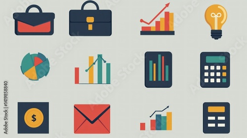 A flat-design business icon set with images of a briefcase, calculator, bar chart, and lightbulb for innovation