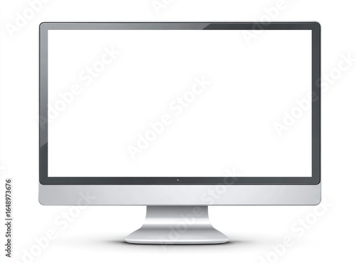 A flat-screen computer monitor, front view, with blank white display. Sleek, modern design. Gray bezel and stand