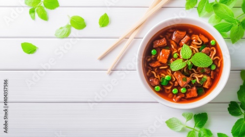 A flavorful bowl filled with spicy noodle soup garnished with fresh green vegetables and herbs, placed on a wooden table