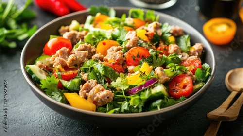 A flavorful bowl of spicy minced pork salad with fresh herbs, bright veggies, and a zesty dressing, perfect for highlighting fresh, aromatic ingredients.