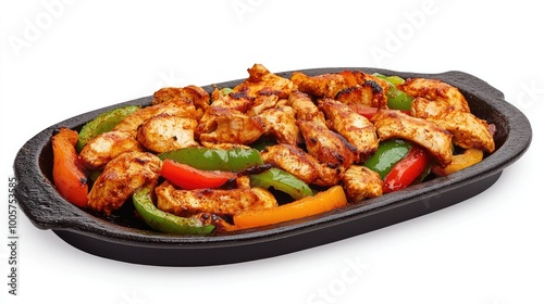 A flavorful chicken fajita platter with sizzling pieces of chicken and colorful bell peppers, presented on a bright white background for a fun presentation.