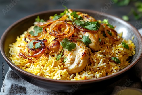 A flavorful dish of biryani rice with juicy chicken, saffron rice, and crispy fried onions, garnished with fresh herbs and served in a traditional bowl.