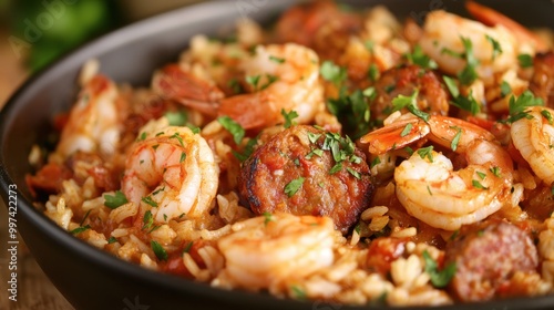 A flavorful jambalaya filled with shrimp, sausage, and rice, presented in a vibrant dish with herbs sprinkled on top.