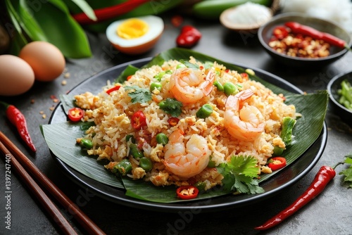 A flavorful plate of shrimp fried rice served on banana leaf.
