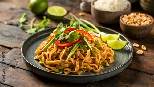 A flavorful plate of traditional Thai stir-fried Pad Thai noodles garnished with fresh cilantro, peanuts, and lime wedges on a dark wooden table