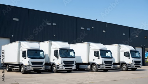 A fleet of white delivery trucks parked in a row outside a warehouse, representing logistics, transportation, or delivery services.