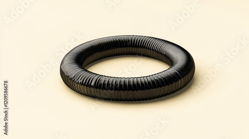 A flexible black corrugated drain pipe coiled neatly on a pale yellow background