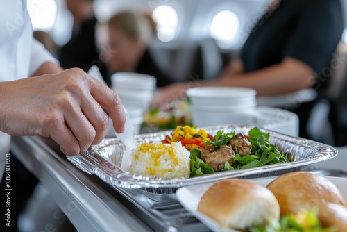 A flight attendant carefully serves a gourmet meal to passengers, highlighting the premium dining experience offered during flights in spacious modern cabins.