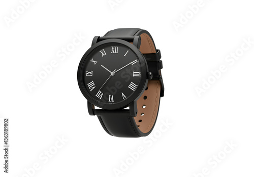 A floating black wristwatch with Roman numerals, isolated on a solid white background.
