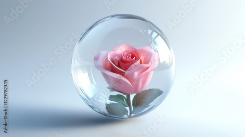 A floating glass orb with a miniature rose and heart inside, surreal fantasy art, 3D render, isolated on white background.