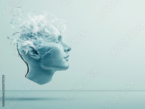 A floating head made of glass, inside swirling with liquid imagination and abstract symbols
