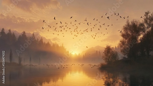 A flock of birds flying over a tranquil lake at sunrise