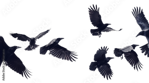 A flock of black birds soaring through the sky, featuring crows with a transparent PNG background.