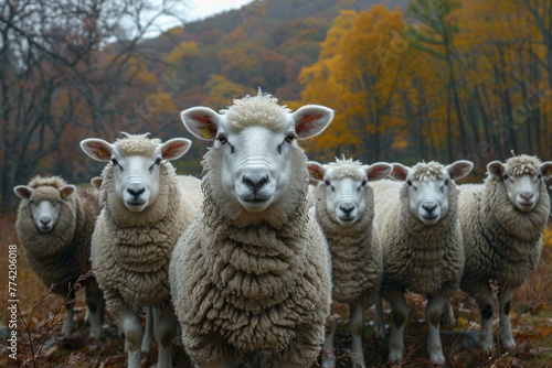 A flock of sheep with thick wool calmly standing together amidst a serene fall landscape in the forest