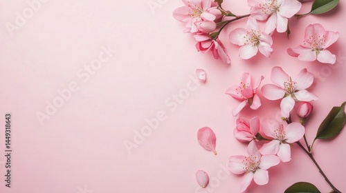 A floral arrangement with pink, red, and white flowers and green leaves on a pink background.