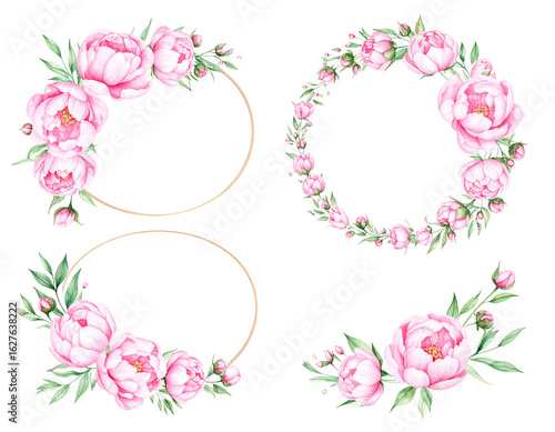 A floral frame of pink flowers and roses, perfect for a wedding or Valentine's card design, with a heart and leaf pattern border illustration