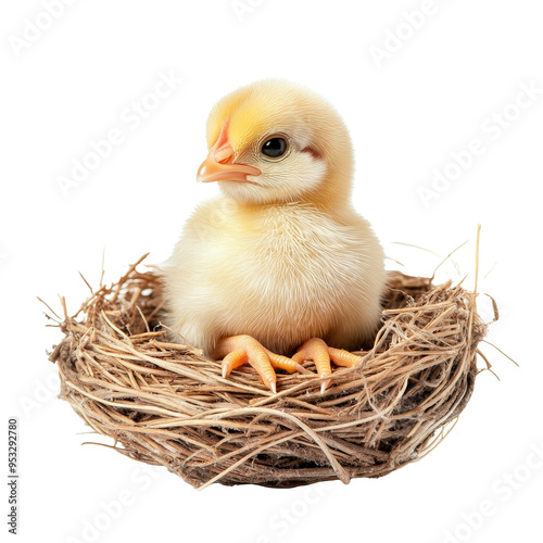 A fluffy baby chicken nestled in a natural straw nest against a clean transparent background, radiating innocence and warmth, baby chicken in nest on transparent background