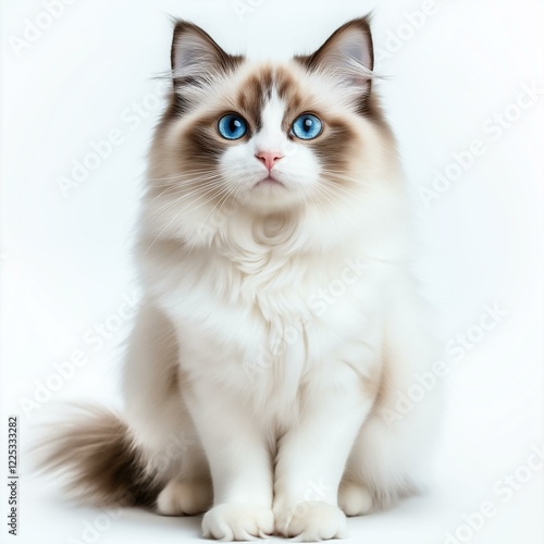 A fluffy cat with striking blue eyes, perfectly captured in a bright, minimalist setting.