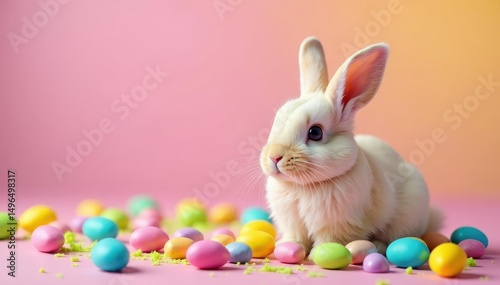 A fluffy Easter bunny surrounded by colorful Easter candy , cheerful, colorful, candy