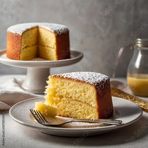 A fluffy golden sponge cake on a white plate, with a single slice cut out and slightly pulled forward. The cake has a soft, airy texture with a light dusting of powdered sugar on top. Bright, appetizi