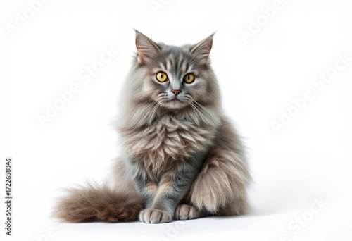A fluffy gray cat sits alone against a white background, domestic cat, calm