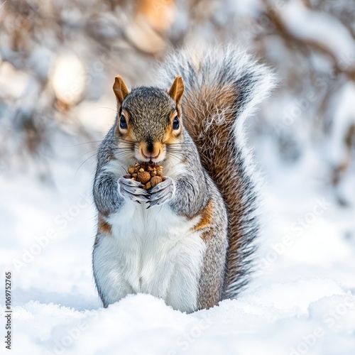 A fluffy gray squirrel stands in the snow, holding a pine cone, surrounded by a winter landscape.