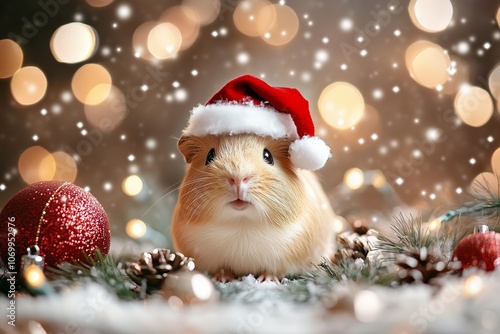 A fluffy guinea pig wearing an adorable Santa hat, festive decorations, cozy holiday scene