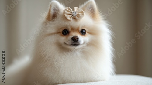 A fluffy Pomeranian dog sits adorably, dressed with a bow and exuding charm indoors