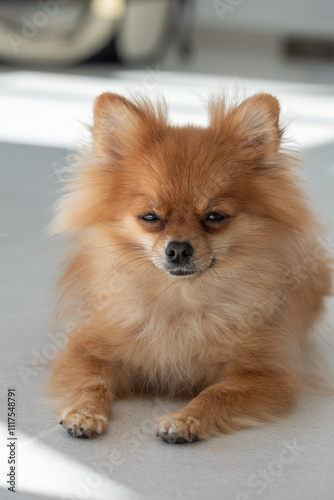 A fluffy Pomeranian relaxing peacefully on a bright indoor floor in the afternoon sunlight