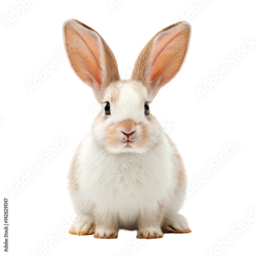 A fluffy rabbit with large ears sits upright, showcasing its soft white and light brown fur.
