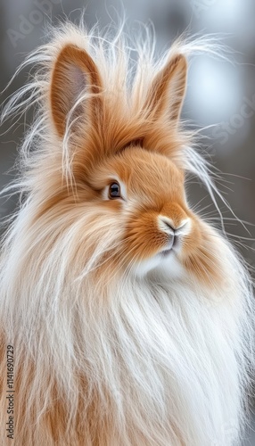 A fluffy rabbit with long fur and expressive features, set against a soft background.