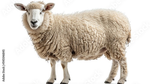 A fluffy sheep stands upright, showcasing its woolly coat against a white background.