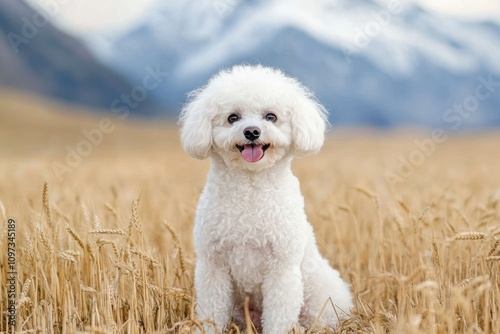 A fluffy white dog sitting in a golden field with mountains in the background.