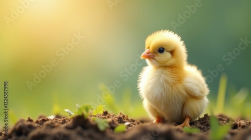 A fluffy yellow chick explores its new world, bathed in the warm glow of the morning sun, amidst sprouting vegetation and fertile earth.