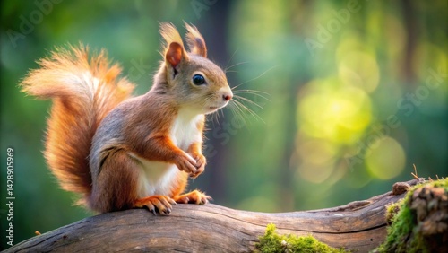 A fluffy-tailed red squirrel sits perched on a mossy log in a sun-dappled forest, showcasing its vibrant fur and alert expression.