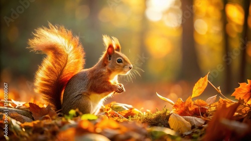 A fluffy-tailed squirrel basking in the warm autumn sunlight amidst a carpet of fallen leaves, a picturesque woodland scene of vibrant fall colors and wildlife
