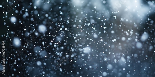 A flurry of snowflakes fills the air, creating a dreamy winter wonderland in a serene, cold setting.