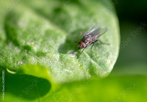 A fly on a green leaf of a plant
