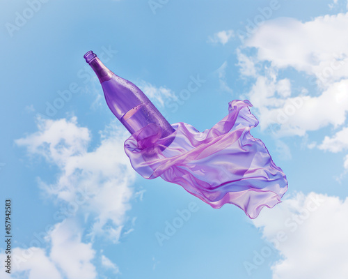 A flying champagne bottle surrounded by purple fabric cloth. Summer Festive party outside on a sunny day.