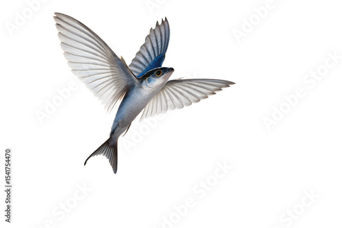 A flying fish with large, white wings and a blue-tinted body. The fish is depicted against a transparent background, showcasing its unique features and graceful flight.