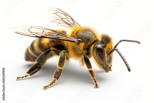 A flying honey bee on a white background cutout. Macro side close-up view. macro.